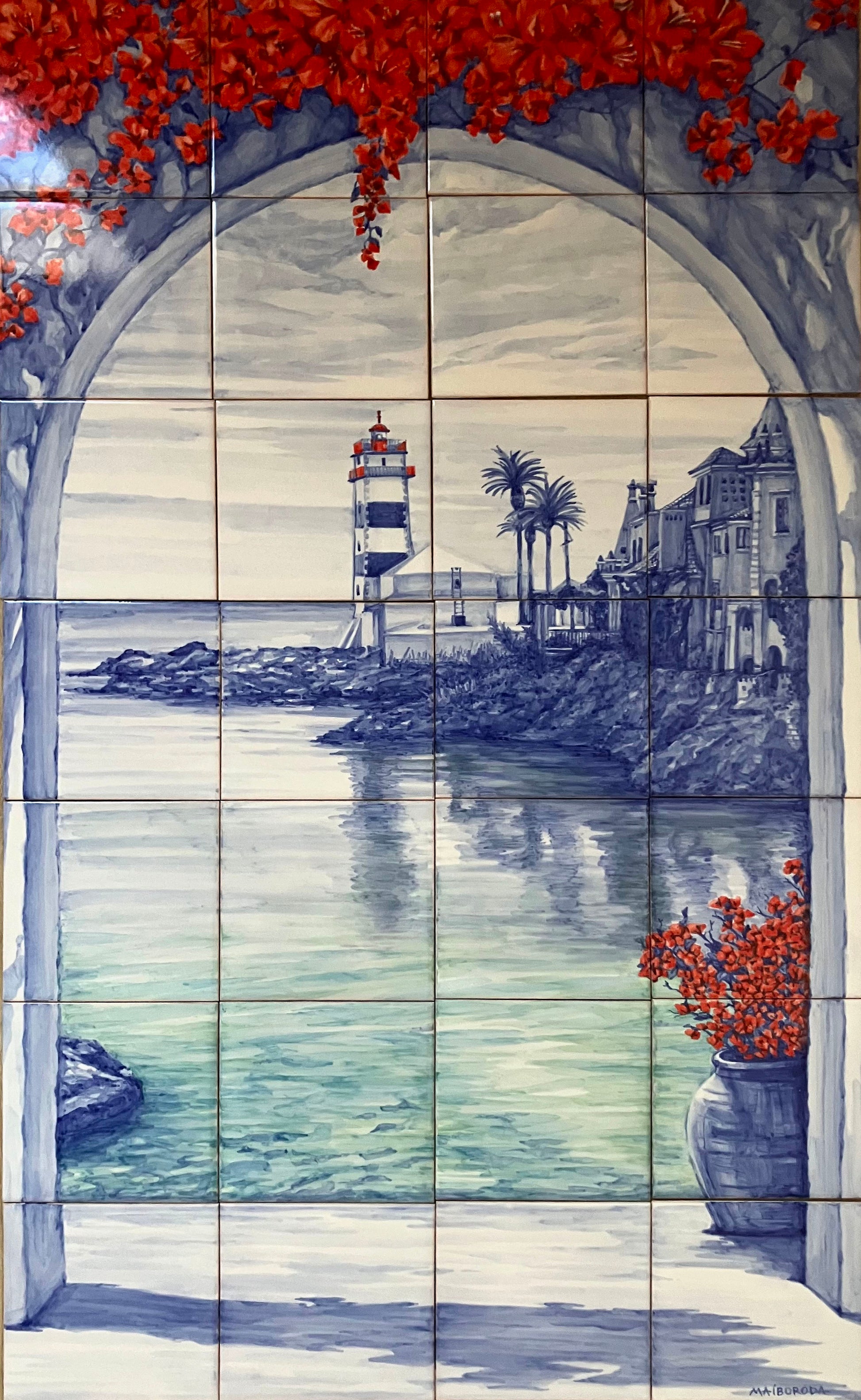 Hand painted tile mural "Farol". A Set of 28 glazed ceramic tiles. Balcony project